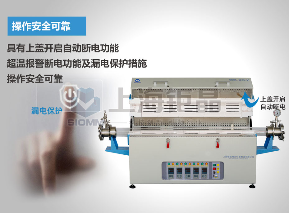 主要功能和特点: 1、 内置五个加热温区,可以营造300℃内不同的温度梯度; 2、 五温区温度控制系统采用人工智能调节技术,具有PID调节、自整定功能,并可编制30段升降温程序,控温精度±1℃; 3、 炉盖可打开,可以实时观察加热的物料,并能迅速降温,满足材料骤冷骤热的实验需要; 4、 炉膛采用日本技术真空吸附成型的优质氧化铝多晶体纤维无机材料,保温性能好,耐用,拉伸强度高,无杂球,纯度高,节能优于其它国内纤维材料; 5、 加热元件采用优质合金丝0Cr27Al7Mo2,具有表面负荷高、电阻率高、抗氧化性能好、经久耐用等特点,最高温度可达1200℃; 6、 炉管材质选用高纯石英管,高温下化学稳定性强,耐腐蚀,热膨胀系数小,能承受骤冷骤热的温度变化,经久耐用,不易断裂; 7、 出口标准,静电喷涂的双层壳体,配有空气隔热技术和热感应技术驱动智能化风冷系统,表面温度低; 8、 预留485转换接口,可通过我公司专用软件,与计算机互联,可实现单台或多台电炉的远程控制、实时追踪、历史记录、输出报表等功能,可安装无纸记录仪,实现数据的存储、输出; 9、采用KF快速法兰密封,只需要一个卡箍就能完成法兰的连接,放、取物料方便快键,减少因安装法兰而造成加热管损坏的可能; 10、预留真空、气路快速接口,可配合我公司真空系统,混气系统使用; 11、上盖开启自动断电,超温和断偶报警断电功能及漏电保护措施,操作安全可靠。 | |